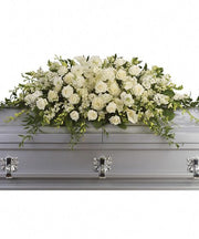 Honor your loved one with a beautifully handcrafted white casket spray designed to bring comfort and peace during the service. This elegant tribute features premium roses, hydrangeas, snapdragons, lilies, and lush seasonal greens for a timeless and dignified presentation.