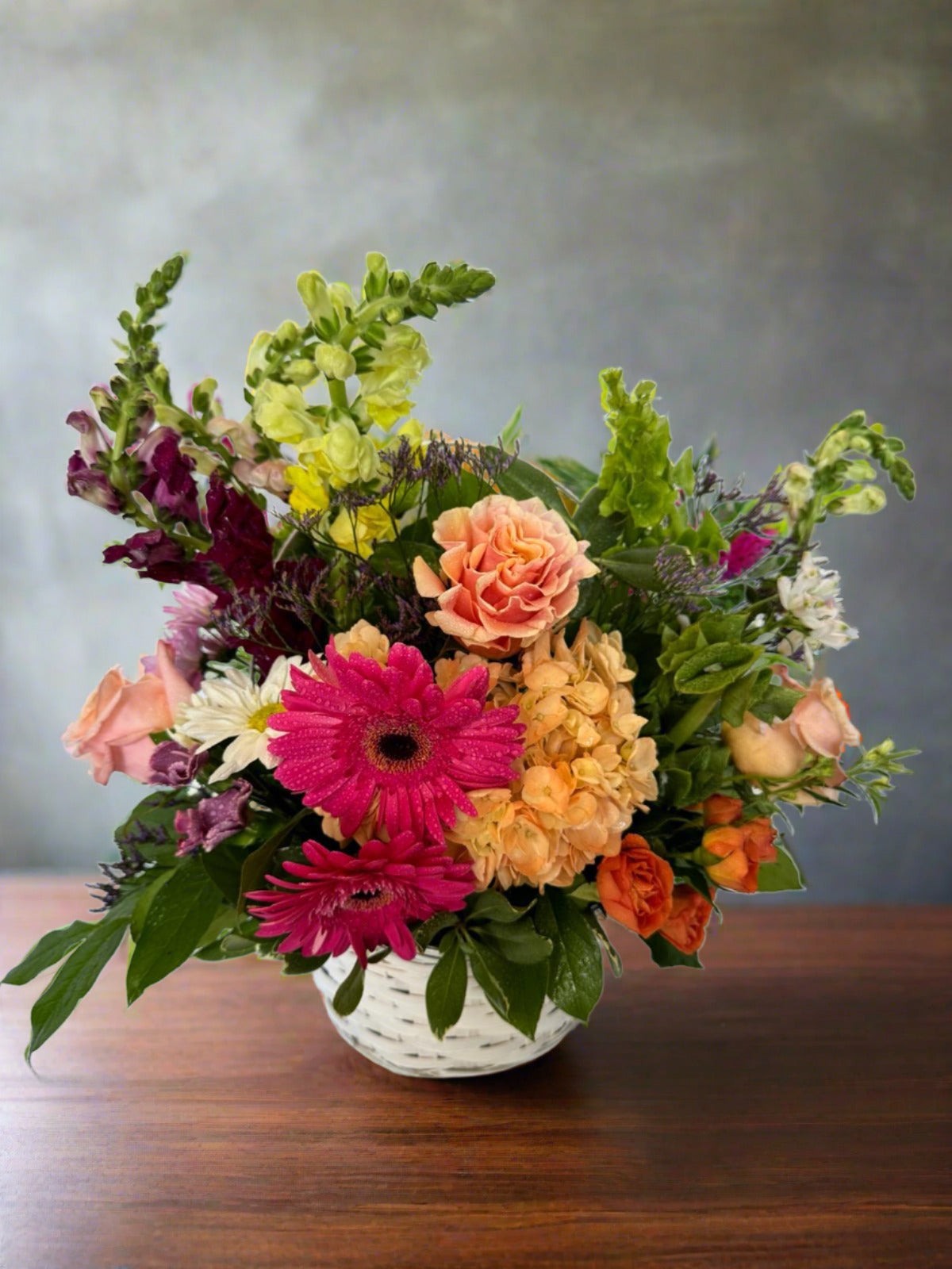 Experience the beauty of nature with our Garden Splendor flower basket. Bursting with a vibrant assortment of colorful flowers, delicate fillers, and lush greenery, this enchanting arrangement is artfully presented in a charming white-handled, reusable basket. Perfect for brightening any space or sending heartfelt well-wishes, the Garden Splendor basket is a timeless expression of natural elegance."